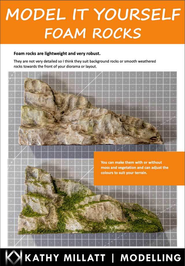 Model It Yourself: Foam Rocks accompanies the free YouTube video with step by step instructions on how to model lightweight foam rocks. These are excellent for background or smooth, weathered rocks. They are really lightweight which would work very well on portable dioramas or layouts.