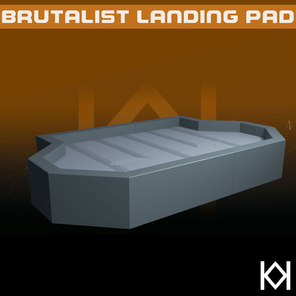 This modular landing pad was inspired by the Siege of Mandalore and features tops with etched lines and sides that could easily be brutalist architecture.Made to work with scales ranging from 28mm to 40mm.